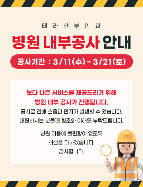 TERRA(대지)와 HERA(여신)을 뜻하는 테라산부인과는 방문하시는 모든 여성이 여신처럼 머물다 가실 수 있는 편안한 곳이 되도록 노력하겠습니다.